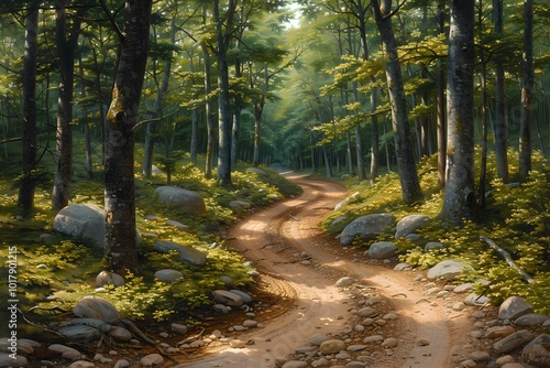 © D, Obraz premium Serene Forest Pathway Winding Through Lush Woodland for Nature Landscape Design