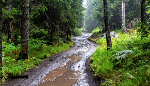 © Kitta Studio, Fototapeta premium Serene Forest Pathway with Muddy Trail Surrounded by Greenery