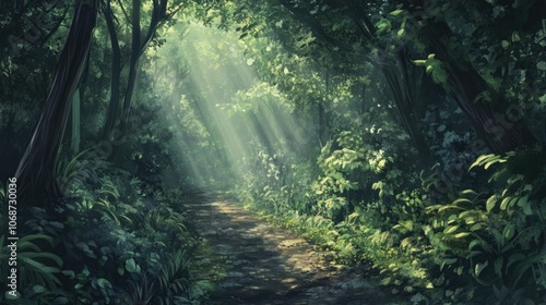 © SETSU ST, Fototapeta premium Serene Forest Pathway with Sunlight Beams