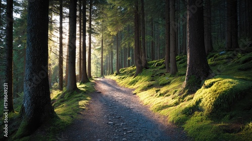 Fototapeta premium Serene Forest Pathway with Sunlight Filtering Through Tall Trees, Lush...