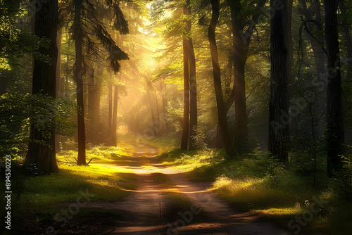© Zape, Obraz premium Serene forest pathway with sunlight filtering through the trees.