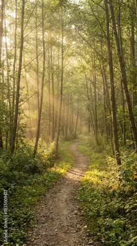 © Kitta Studio, Obraz premium Serene Forest Pathway with Sunlight Filtering Through Trees