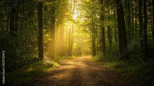© Kitta Studio, Obraz premium Serene Forest Pathway with Sunlight Illuminating the Landscape