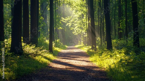 © Kitta Studio, Obraz premium Serene Forest Pathway with Sunlight Streaming Through Green Trees