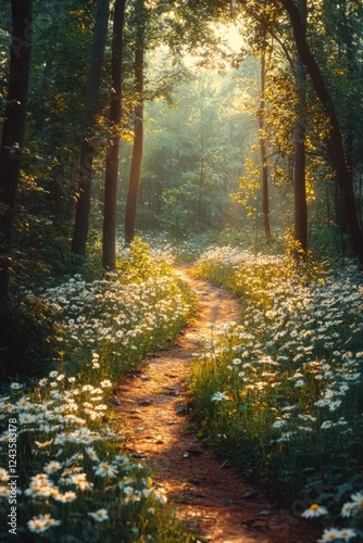 © Sunshine, Fototapeta premium Serene Forest Pathway with Sunlit Daisies and Lush Greenery in a Tranquil Woodland Setting at Sunrise