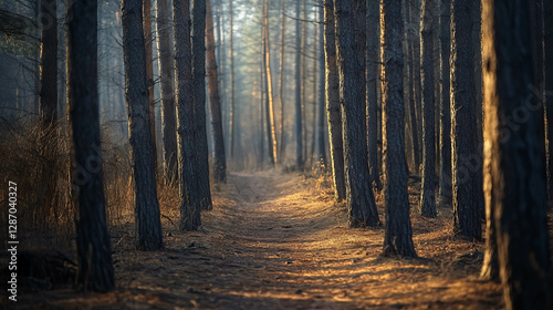 © Artem, Naklejka premium Serene forest pathway with sunlit trees in tranquil wilderness