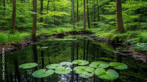 Obraz premium Serene forest pond, lush green trees, tranquil water lilies, peaceful nature scene, ideal for relaxation