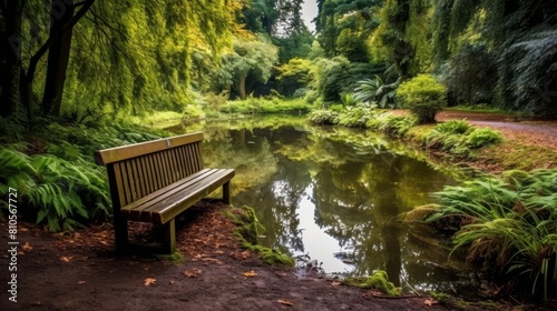 © Balaraw, Fototapeta premium serene forest pond with wooden bench