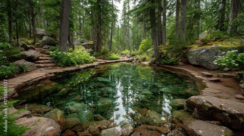 © Alunn cans, Fototapeta premium Serene forest pool with clear water and surrounding rocks