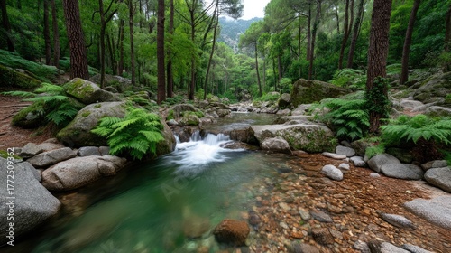 Obraz premium Serene Forest River Cascading Over Rocks Amidst Lush Greenery and Tall Trees...