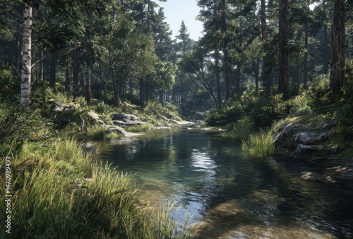 Obraz premium Serene forest river flowing through lush green trees and moss-covered rocks...