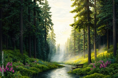 © Satisgitfied, Obraz premium Serene Forest River Landscape with Morning Sunlight and Mist