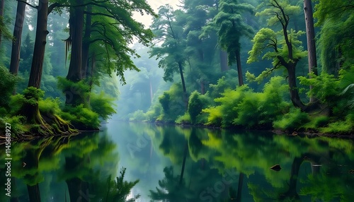 © Romeo, Obraz premium Serene Forest River Reflecting Lush Greenery