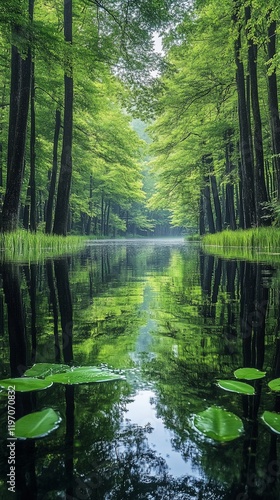 Obraz premium Serene forest river reflection, peaceful morning mist