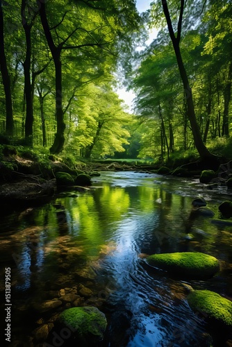 Fototapeta premium Serene forest river scene lush green canopy sunlight