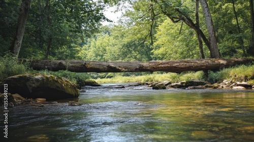 © adiba sakila atmari, Obraz premium Serene Forest River with Fallen Log Bridge