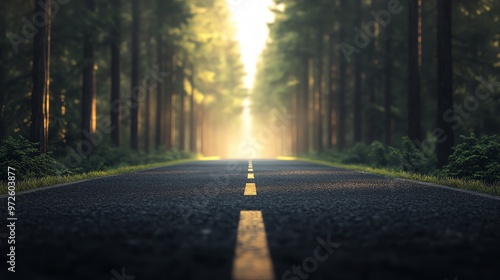 Fototapeta premium Serene forest road stretching through a dense canopy, illuminated by soft...