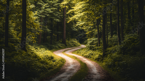 Obraz premium Serene Forest Road: Tranquil Path Curving Through Lush Woodland Beauty