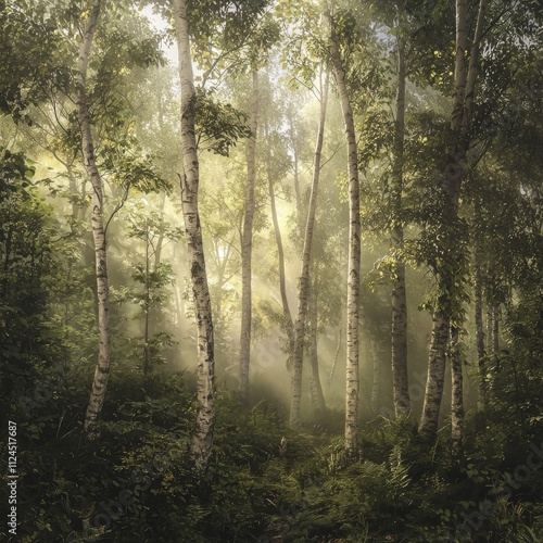 Fototapeta premium Serene forest scene featuring tall birch trees, lush greenery, and soft light...