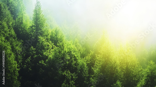 © Thanakit , Obraz premium serene forest scene showcasing lush green trees enveloped in soft mist, illuminated by gentle sunlight