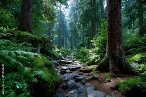 © YouraPechkin, Obraz premium Serene forest scene with a rocky stream flowing through lush greenery in early morning light