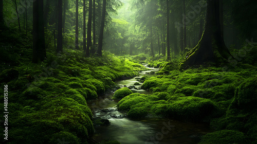 © Nhoeb, Fototapeta premium Serene Forest Scene with Mossy Stream and Soft Natural Light