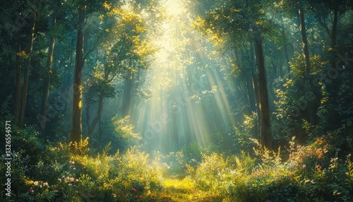 © moon, Obraz premium Serene Forest Scene with Sunlight and Lush Greenery in Anime Style