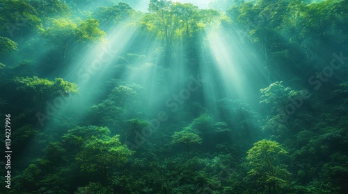 Fototapeta premium Serene forest scene with sunlight filtering through lush trees, creating a...