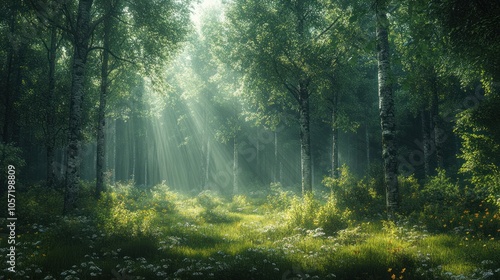 © Moza, Fototapeta premium Serene forest scene with sunlight filtering through trees.