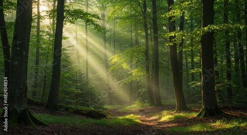 Fototapeta premium Serene forest scene with sunlight filtering through trees, showcasing...