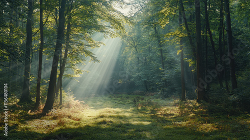 Obraz premium serene forest scene with sunlight streaming through trees, creating tranquil...