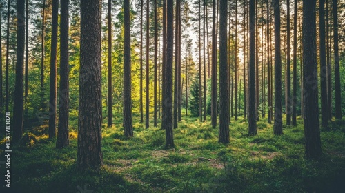 Obraz premium Serene forest scene with tall trees and lush greenery illuminated by soft...