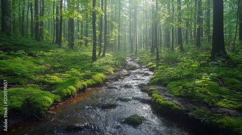 Fototapeta premium Serene Forest Stream: A Misty Morning in the Woods