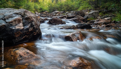 © satisfied, Fototapeta premium Serene Forest Stream: A Tranquil River Scene