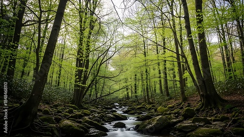 Fototapeta premium Serene forest stream flowing through lush green trees and mossy rocks in a...