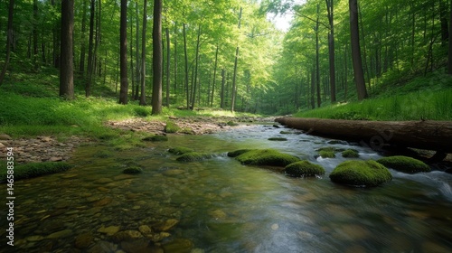 © Orawan, Fototapeta premium Serene forest stream flowing through lush green trees Calm water glides over mossy rocks Tranquil nature scene