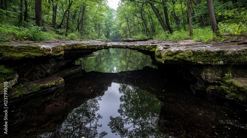 © BROPRADANA, Obraz premium Serene forest stream flowing under natural stone bridge