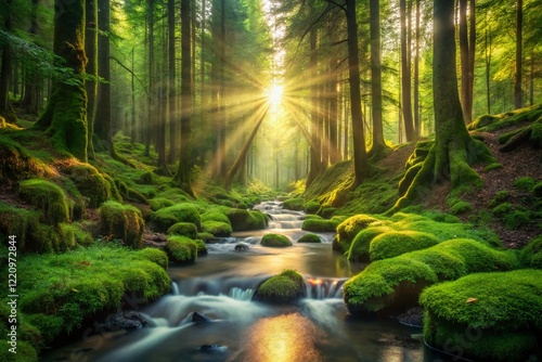 © Man888, Fototapeta premium Serene Forest Stream: Minimalist Nature Photography - Tranquil Green Canopy Sunlight