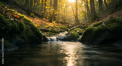 © Nurhansyah, Obraz premium Serene Forest Stream: Mossy Rocks and Golden Sunlight