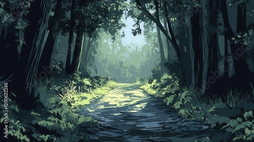 Obraz premium Serene Forest Stream Path Through Lush Green Trees