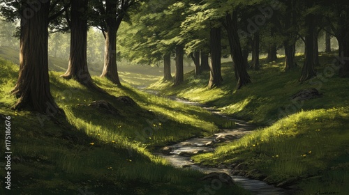 © Berkah1789, Obraz premium Serene Forest Stream Sunlight Through Trees