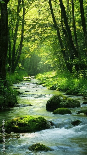 © Kitta Studio, Obraz premium Serene Forest Stream with Lush Greenery and Gentle Flowing Water