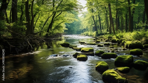 © Nice Seven, Obraz premium Serene Forest Stream with Mossy Rocks