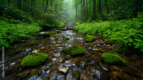 © artzone, Obraz premium Serene Forest Stream with Mossy Rocks and Lush Green Vegetation