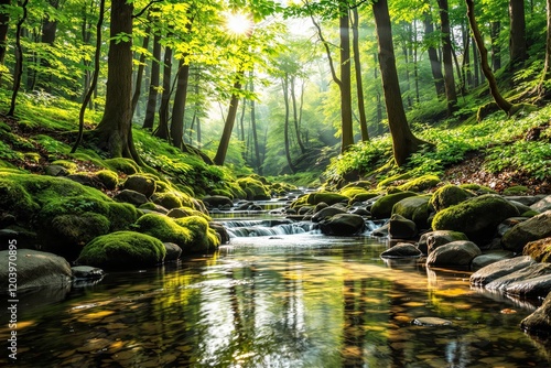 © Pixels Hunter, Obraz premium Serene forest stream with sunlight filtering through lush green leaves.