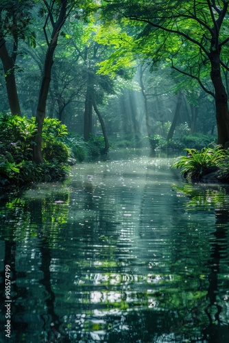 © AIPhoto, Obraz premium Serene Forest Stream with Sunlight Filtering Through Lush Green Trees and Reflecting on Calm Water