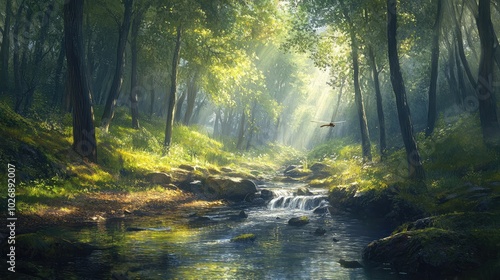 Fototapeta premium Serene Forest Stream with Sunlight Filtering Through Trees