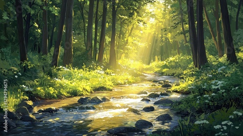 © Tania, Obraz premium Serene forest stream with sunlight filtering through trees