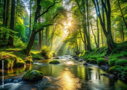 © Caitlin, Obraz premium Serene Forest Stream with Sunlight Filtering Through Trees - Peaceful Woodland Scene with Lush Greenery and Soft Light