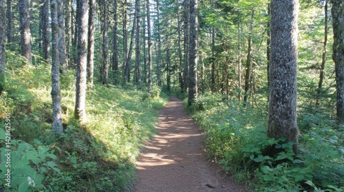 Fototapeta premium Serene Forest Trail: A Pathway Through Lush Green Canopy